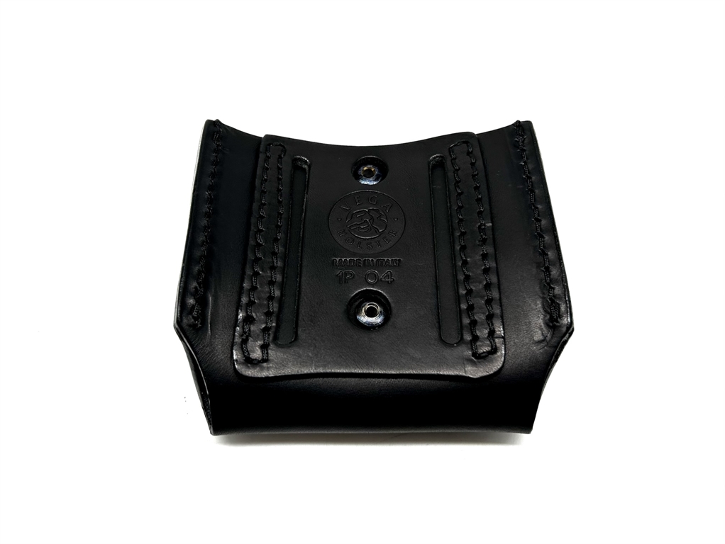 Porta caricatore bifilare doppio aperto. Vite di ritenzione. Colori disponibili: nero e marrone. Passante con doppia asola per cinturoni, altezza sino a 6 cm. Larghezza 12 cm, altezza 10,5 cm. Peso lordo: 99 grammi. Prodotto in Italia.