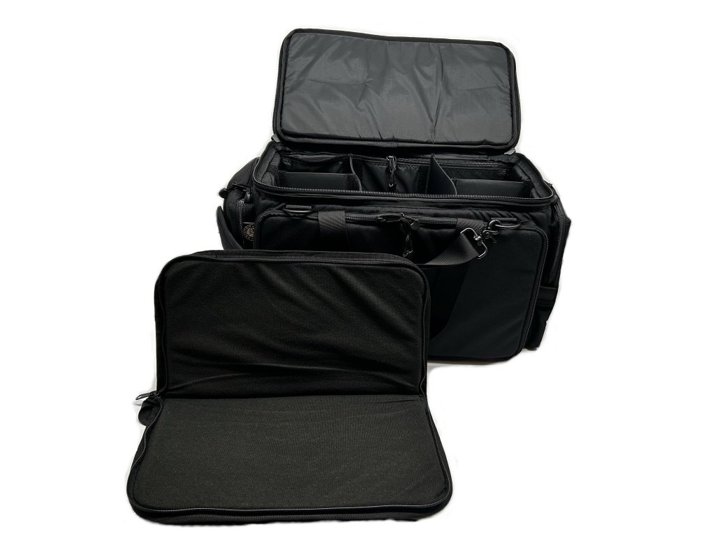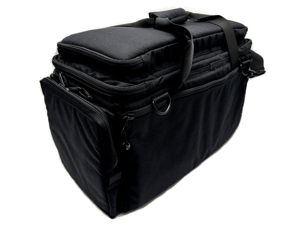 Borsone con tracolla imbottito con 4 tasche esterne, due borsetti interni porta pistola rettangolari con cerniera asportabili, una tasca esterna ad apertura totale con porta caricatori. Vano centrale con separatori regolabili. Dimensioni: 46x34x30 cm. Peso lordo: 2400 grammi.