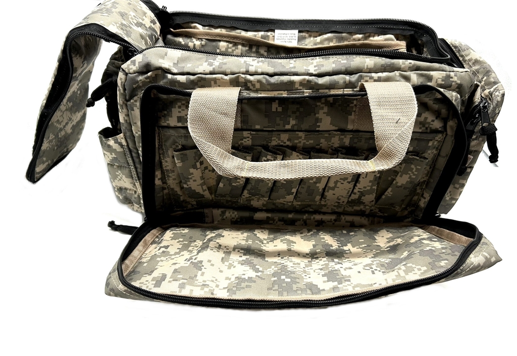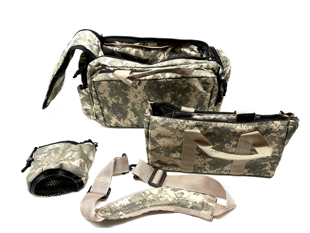 Borsone in nylon imbottito dotato esternamente: di un ampia tasca con cerniera con all interno 8 porta caricatori, 4 tasche con cerniere di cui una con finestrella trasparente, una tasca aperta. Ampia apertura centrale con cerniera. All interno due ampie tasche. Dimensioni (senza considerare le tasche esterne): larghezza 44 cm, altezza 28 cm spessore 27 cm. Dotata di maniglia e tracolla imbottita e regolabile per il tasporto. Dotata di una borsetta porta bossoli estraibile con laccetto di chiusura e moschettone. In dotazione si trova una borsa imbottita piu piccola con maniglia e possibilità di attaccare la tracolla. Questa borsa ha due ampie tasche interne con cerniera e due divisori con strip. Dimensioni: larghezza 38 cm, altezza 19 cm, spessore 14,5 cm. peso lordo: 1705 grammi.