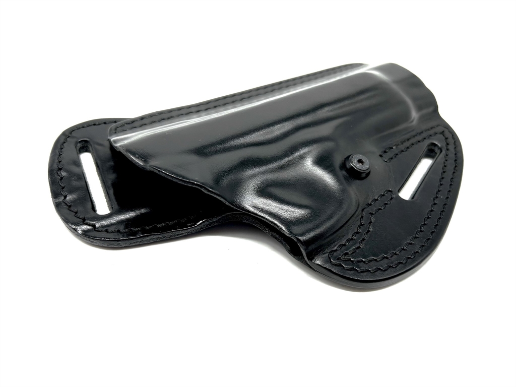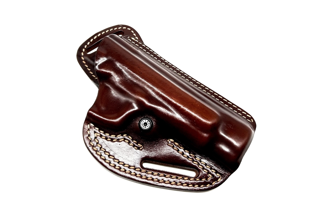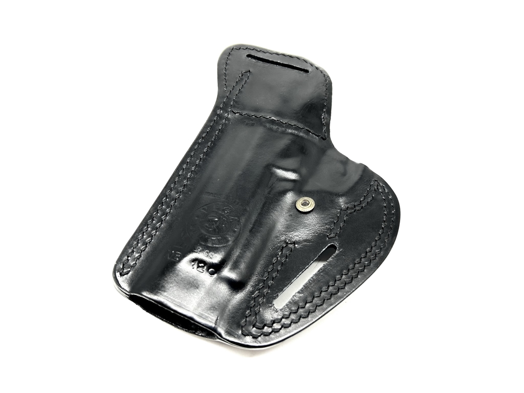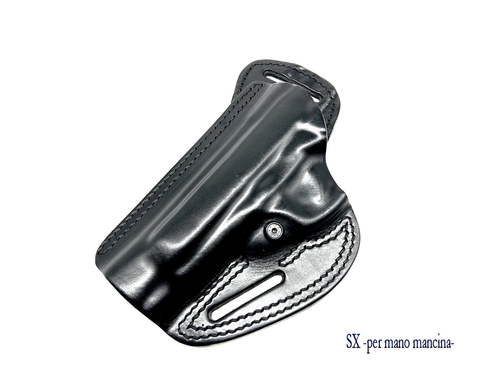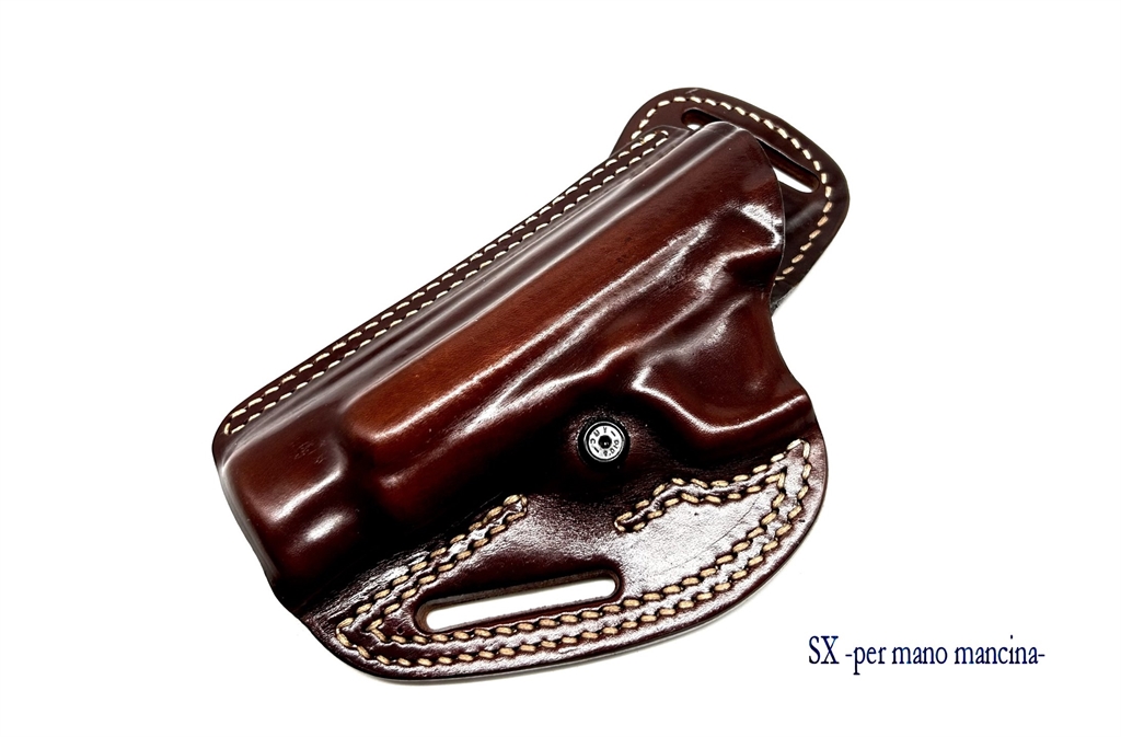 Fondina in cuoio inclinata dietroschiena aperta sopra con vite di ritenzione. La particolare sformatura in avanti rende più confortevole il porto. Prodotta per: Beretta 92, 98, 8000, glock 17, 19, 22, 23, sig suer p220, 225, 226, 228, 229. Colori disponibili: nero o marrone. Altezza ideale della cintura per poter essere adattata al meglio la fondina è di 4 cm. Peso lordo: 125 grammi. Prodotto in Italia.