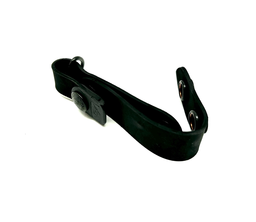 Porta casco in gomma universale con doppio bottone per fissaggio al cinturone e laccetto con bottone a pressione per il collegamento con il casco. Lunghezza 10,5 cm, larghezza 2,5 cm. Prodotto in Italia. Peso lordo: 45 grammi.