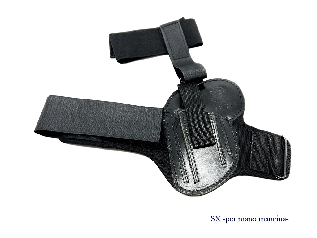 Fondina da caviglia 6.35 con elastico. Doppia fascia di tenuta in cuoio con velcro. Laccino regolabile tramite velcro. In pelle nera. Prodotta per small auto, medium auto, baby auto, revolver 2 e 2,5 pollici. Peso lordo: 125 grammi. Prodotto in Italia.