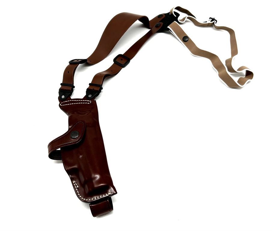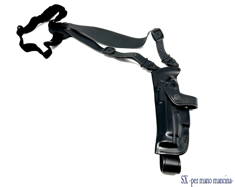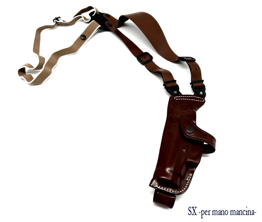 Fondina ascellare verticale in cuoio sformato con sgancio rapido. Disponibile nei colori nero o marrone. Prodotta per Beretta 92, 98, 81, 82, 84, 85, 90 two, 98 A1, px4 storm, 8000, 9000, colt 1911, glock 17, 19, 20, 21, 22, 23, 25, 26, 27, 28, 29, 30, 36, 31, 32, 36, 37, hk usp, walther p99, ppq, p99q, e revolver 2,5, 4 e 6 pollici. Peso lordo: 255 grammi. Prodotto In Italia.