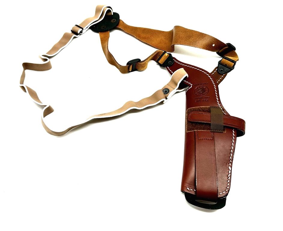 Fondina ascellare verticale in cuoio marrone foderata internamente in scamosciato con fermo alla cintura e sicura regolabile. La particolare forma ad incrocio tiene la fondina più aderente al corpo. Fondina adatta per: Beretta 8000, 9000, Colt commander, Glock 19, 23, 25, 32, 38, Sig Sauer P225, 228, 229, 250, Pro 2022, Tanfoglio carry, Walter pps, ppq, p99q, p99. Peso lordo: 340 grammi. Prodotto in Italia.