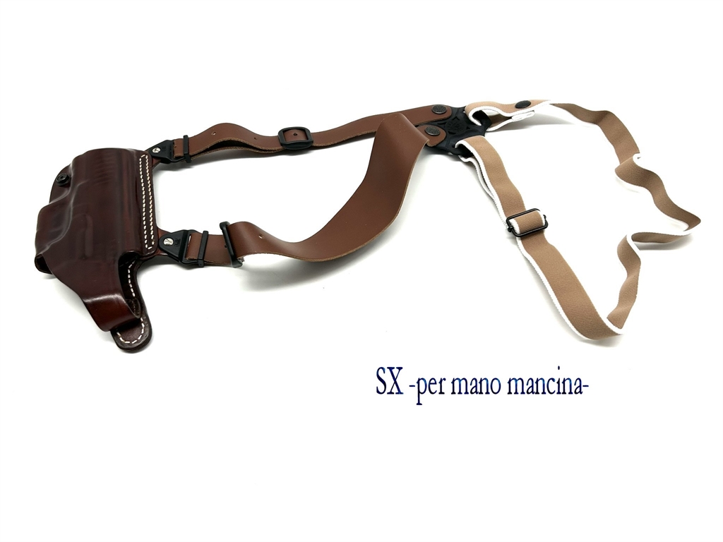 Fondina in cuoio ascellare o da cintura con sgancio rapido. 4 usi: ascellare orizzontale, a cintura sul fianco destro, cross draw e retroschiena. Prodotta per: beretta 92, 98, 84, 9000, beretta apx, px4 storm, 90 two, 98 A1, colt 1911, caracal c, caracal f, glock 17, 19, 20, 22, 23, 26, 27, 30,42 revolver da 2 pollici fino a 4 pollici, sig sauer p226, 228, 229, 230, 232, 2340, pro 2022, hk usp, spriengfield xd, walther p99, ppk, pps. In colore marrone o nero. Prodotto in Italia. Peso lordo: 235 grammi.