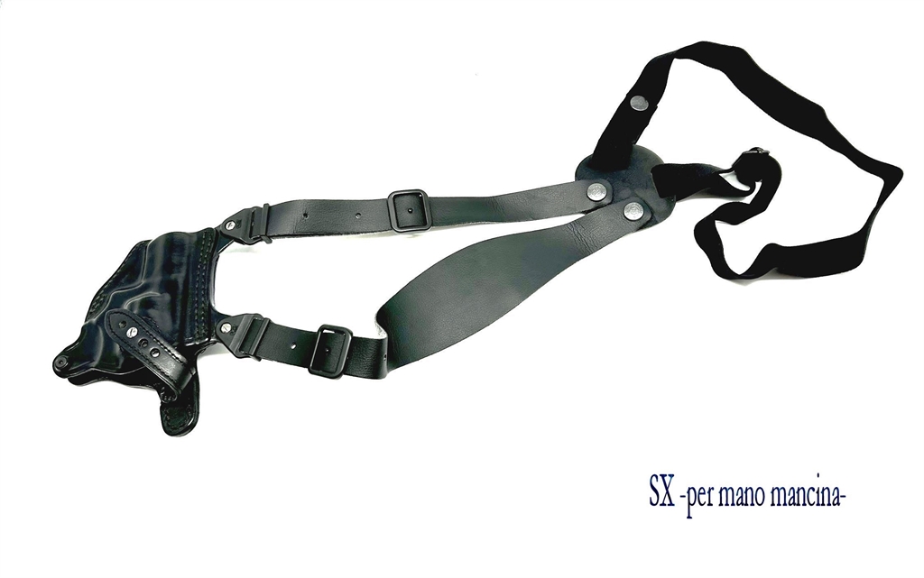 Fondina in cuoio ascellare o da cintura con sgancio rapido. 4 usi: ascellare orizzontale, a cintura sul fianco destro, cross draw e retroschiena. Prodotta per: Beretta 92, 98, 84, 9000, Beretta apx, px4 storm, 90 two, 98 A1, colt 1911, caracal c, caracal f, glock 17, 19, 20, 22, 23, 26, 27, 30, 42, revolver da 2 fino a 4 pollici, sig sauer p226, 228, 229, 230, 232, 2340, pro 2022, hk usp, spriengfield xd, walther p99, ppk, pps. Disponibile nei colori marrone o nero. Peso lordo: 210 grammi. Prodotto in Italia.
