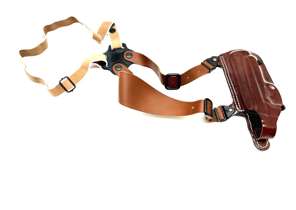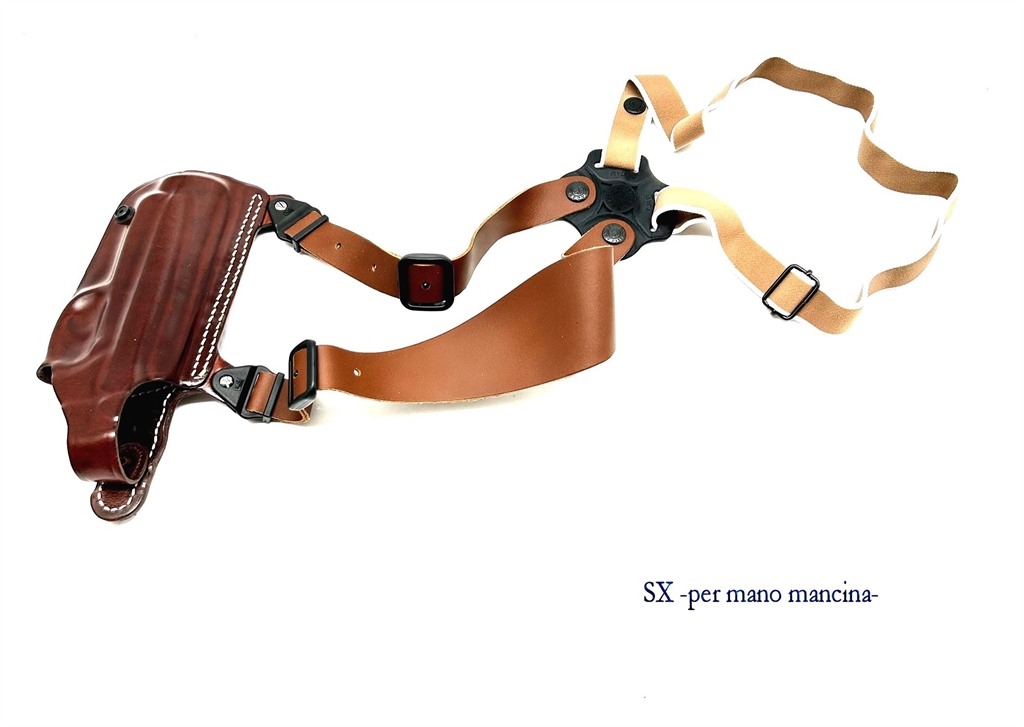 Fondina in cuoio ascellare o da cintura con sgancio rapido. 4 usi: ascellare orizzontale, a cintura sul fianco destro, cross draw e retroschiena. Prodotta per: beretta 92, 98, 84, 9000, beretta apx, px4 storm, 90 two, 98 A1, colt 1911, caracal c, caracal f, glock 17, 19, 20, 22, 23, 26, 27, 30,42 revolver da 2 pollici fino a 4 pollici, sig sauer p226, 228, 229, 230, 232, 2340, pro 2022, hk usp, spriengfield xd, walther p99, ppk, pps. In colore marrone o nero. Prodotto in Italia. Peso lordo: 270 grammi.