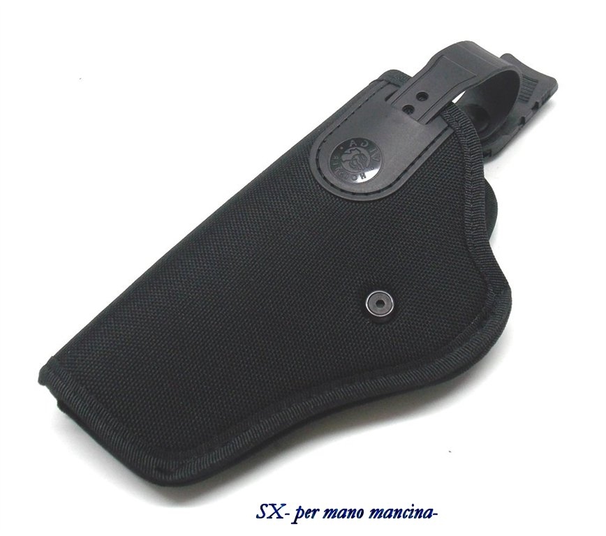 Fondina da cintura in cordura nera, sgancio rapido regolabile rinforzato nella parte di pressione, passante in poliuretano. Disponibile in colore nero. Prodotto per i seguenti modelli: beretta 90two, 98A1, px4 storm, 92, 98, 84, 8000, 9000, beretta apx, bersa, caracal c, f, revolver da 2,5 a 6 pollici, glock 17, 19, 20, 21, 22, 23, 25, 26, 27, 28, 29, 30, 31, 32, 36, 37, 38, sig sauer p220, 225, 226, pro 2022, taurus g3, walther ppq, p99, p99q. Le asole del passante sono per cinturoni da 4 a 5 cm. Peso lordo: 100 grammi. Prodotto made in Italy.