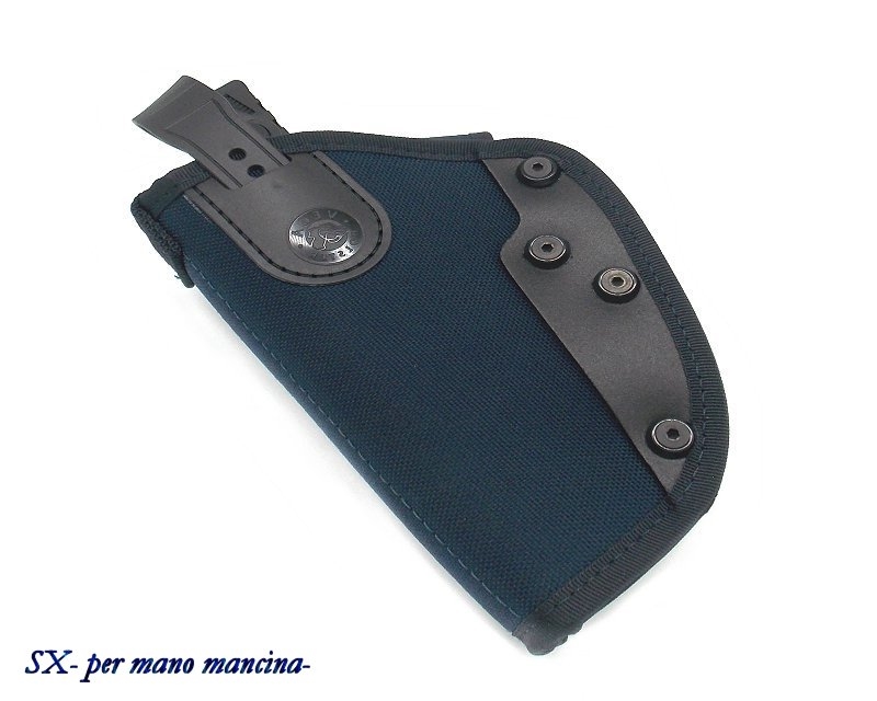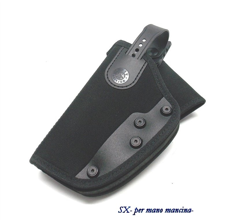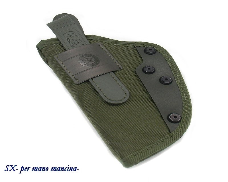Fondina in cordura da fianco, sistema di sgancio rapido regolabile e amovibile. Supporto in cordura. Posizione verticale con inclinazione. Il passante è per cinturoni alti 5 cm. Prodotta per large auto tipo beretta 92 o 98 fs, beretta apx, revolver 4, sig 228,229, beretta 8000, glock 17/19, sig sauer p266, beretta 84 f, h&k usp-w. p99, ppq, p99q, glock 20, px4 storm. Colori disponibili: nero, verde, blu o bianco. Peso lordo: 310 grammi. Prodotto in Italia.