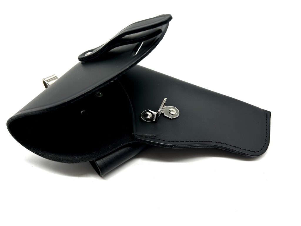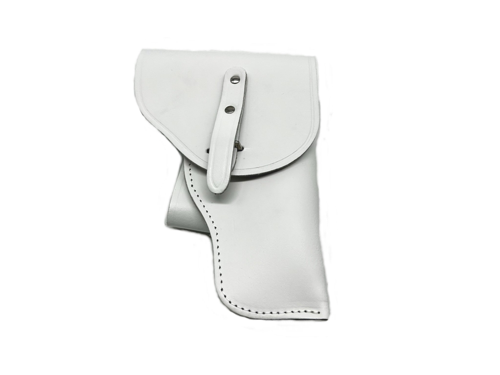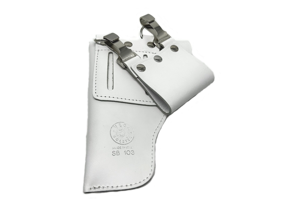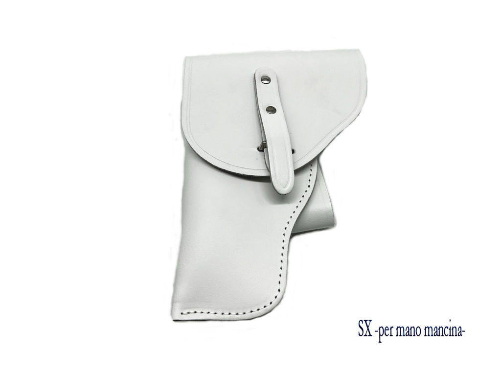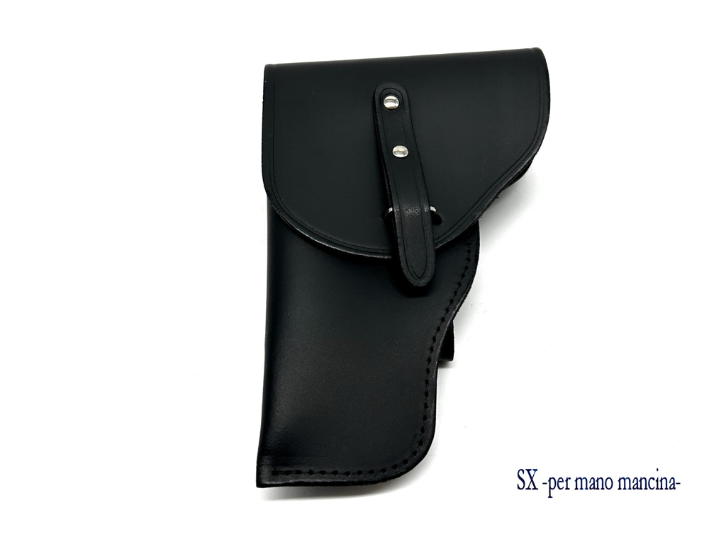 Fondina in cuoio con pattina. Doppio moschettone e passante. Colore disponibile: nero e bianco. Prodotta per le seguenti armi: Beretta 92/98, 81, 84, 8000 glock 17, 19. 22, 23, 29, tanfoglio gt21, taurus pt92, walther p99. Peso lordo: 221 grammi. Prodotto in Italia.