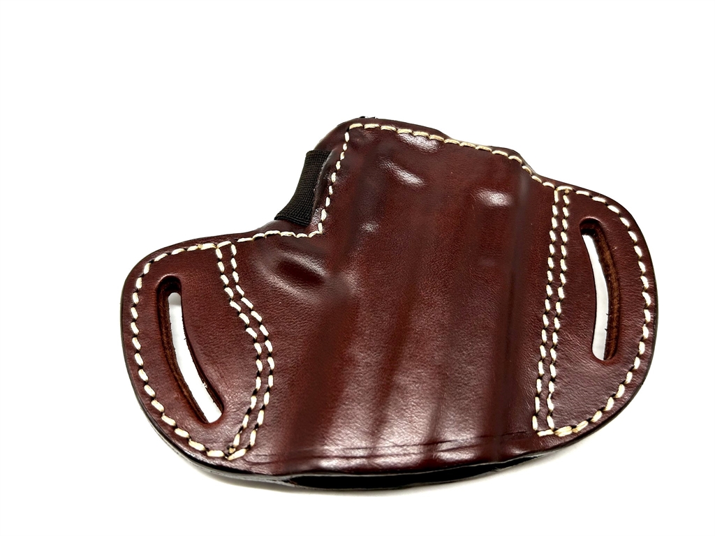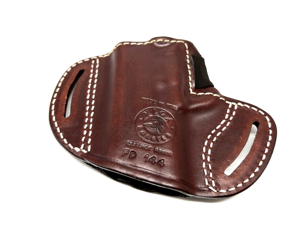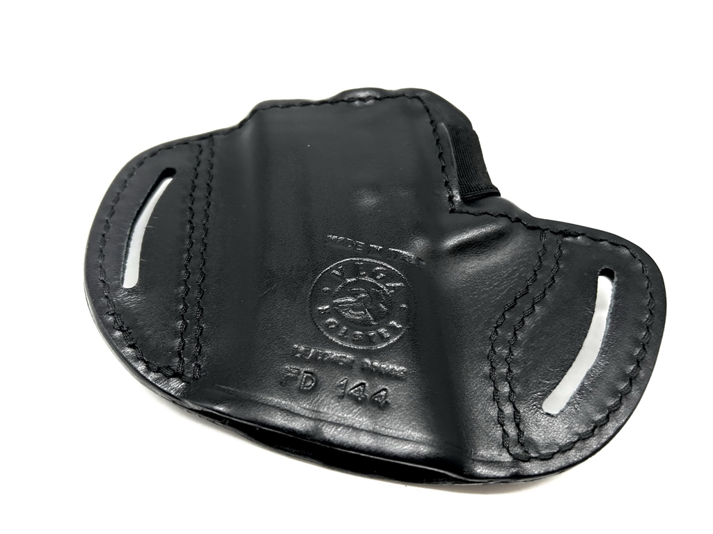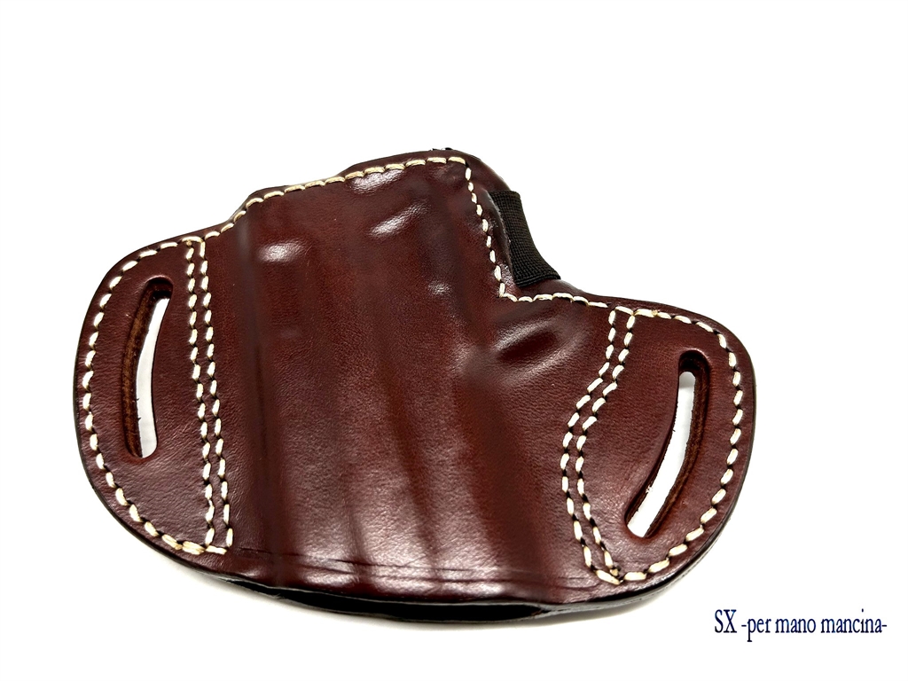 Fondina a fascia, ritenzione dell'arma tramite elastico rinforzato, estrazione a strappo. Sformata in cuoio ingrassato marrone o nero. Altezza ideale della cintura per poter essere adattata al meglio la fondina è di 4 cm. Peso lordo: 90 grammi. Prodotto in Italia. Legenda: dx=destra, sx=sinistra.