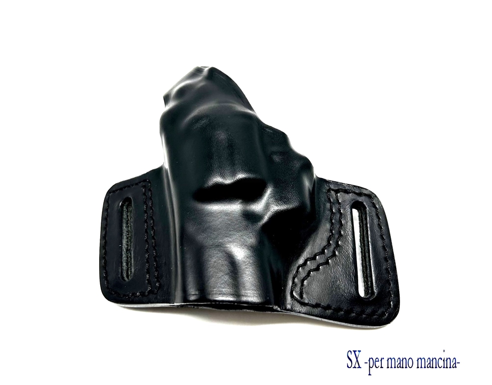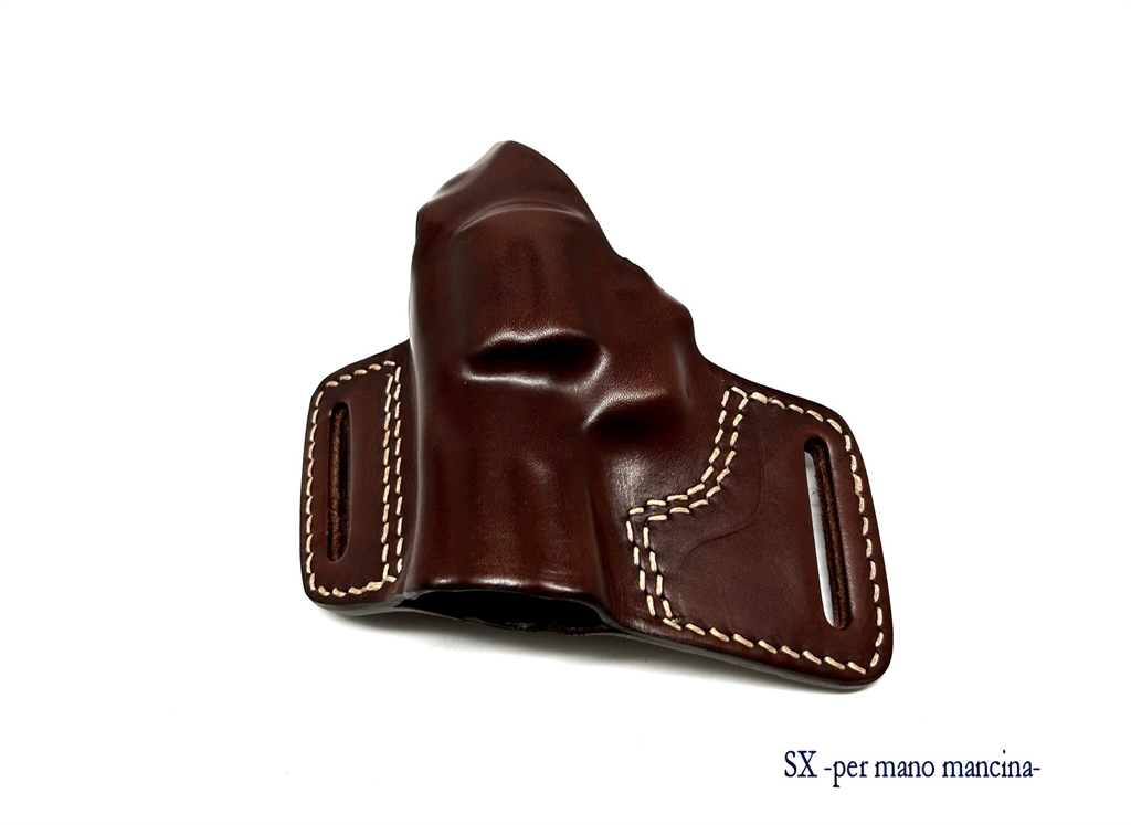 Fondina in cuoio con due asole. Prodotta per: Beretta 92, 98, 84, 8000, px4 storm, 9000, 90 two, 98A1, Beretta APX, caracal c, caracal f, colt 1911, glock 17, 19, 20, 21, 23, 25, 26, 27, 29, 30, 31, 32, 33, 42, walther pps, p99, ppq, p99q, hk usp, sig suer pro 2022, p220, p226, p228, p229, spriengfield xd, taurus g3, revolver da 2,5 a 4 pollici, e baby auto Beretta. Le asole del passante sono per cinture alte 4 cm. Colori disponibili: nero e marrone. Peso lordo: 110 grammi. Prodotto in Italia.