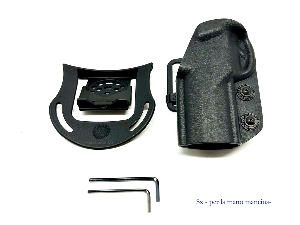 Fondina in polimero a spessore maggiorato. Doppia vite di ritenzione che agisce sul ponticello e sulla canna. Doppio sistema di passante incluso: a) paddle con inclinazioni ed altezza regolabile, b) passante asole con inclinazione ed altezza regolabile. Prodotta per le seguenti armi: beretta 92, 98, px4 storm , colt 1911 e similari, cz sp02 shadow 2,glock 17, 18, 19, 22, 23, 25, 31, 32, 37, h&k usp compact, sig sauer pro 2022, taurus pt92, 99, 100, 101, walther ppq, walther p99q, tanfoglio stock II. Le asole del passante sono per cinturoni alti da 4 a 5 cm. Prodotto in Italia. Peso lordo: 225 grammi.