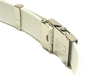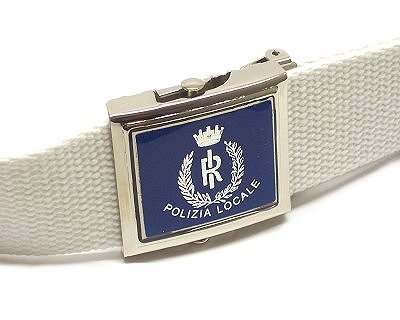Cintura in cotone bianco altezza 4 cm e lunghezza massima 129 cm. Misura regolabile. Fibbia in metallo con scritta Polizia locale. Peso lordo: 160 grammi. Prodotto in Italia.