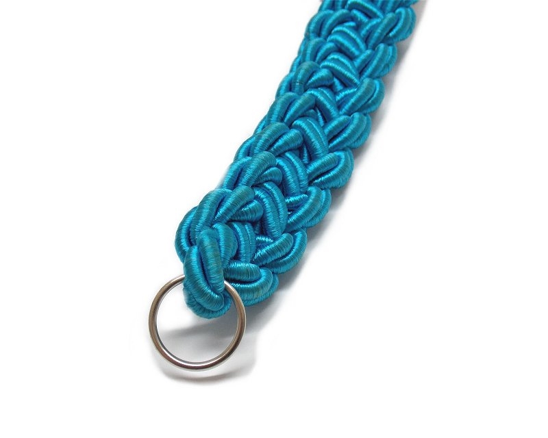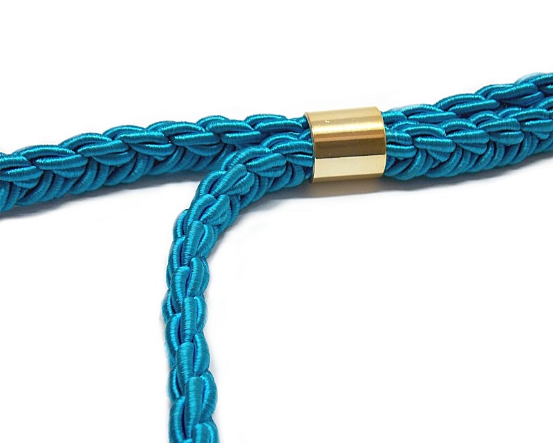 Cordone in tessuto lucido. Lunghezza circa 83 cm. Interamente intrecciato. Colore azzurro. Peso lordo: 92 grammi.