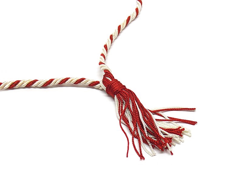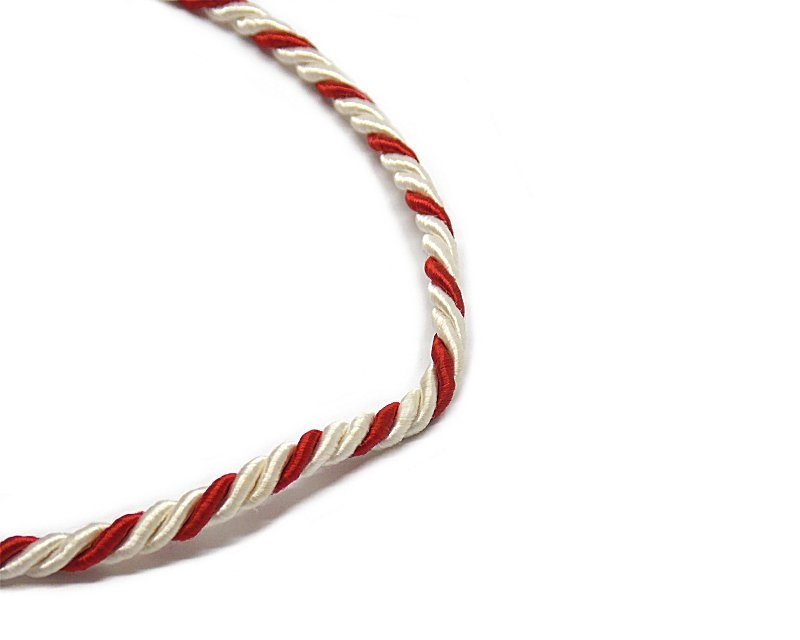 Cordoncino in tessuto lucido intrecciato, con nappina. Lunghezza 42 cm. Colore rosso e bianco. Prodotto in Italia. Peso lordo: 10 grammi.