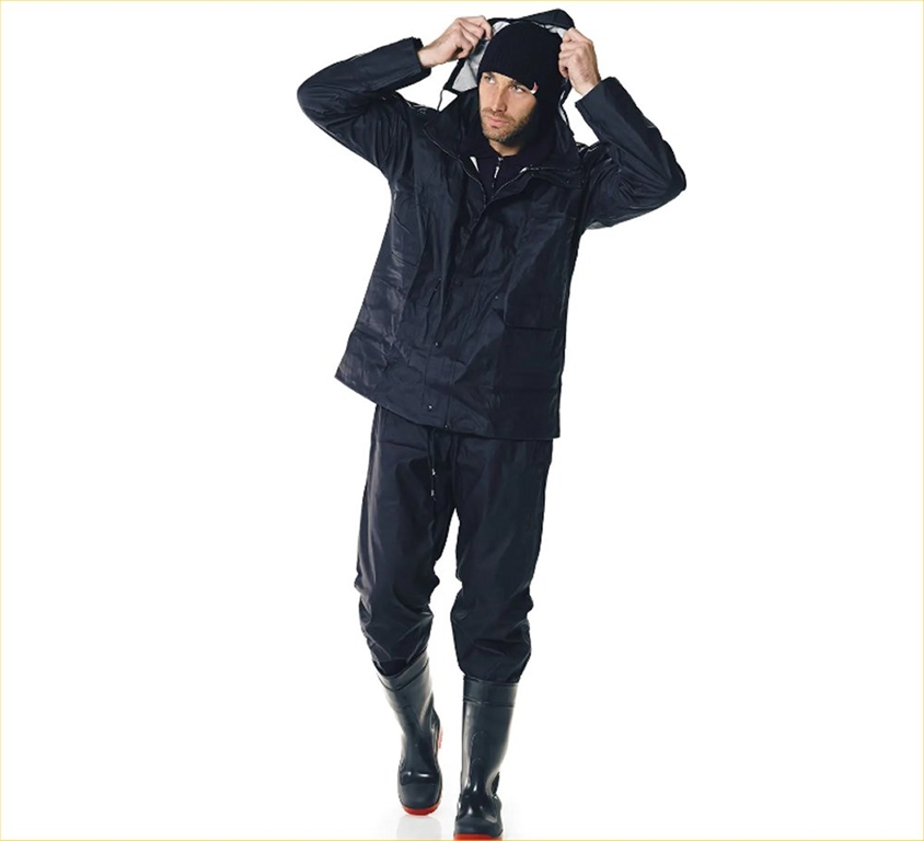 Completo giacca e pantalone in pvc impermeabile blu, foderato internamente. La giacca è dotata sul davanti di due tasconi, di cappuccio avvolgibile e chiusura con cerniera e bottoni. Polsini con elastici. Pantalone con elastico in vita e cerniera nella parte inferiore. Peso lordo: 1625 grammi. Taglie disponibili: M, L, XL, XXL. Conforme alla DIR.89/686/CEE.
