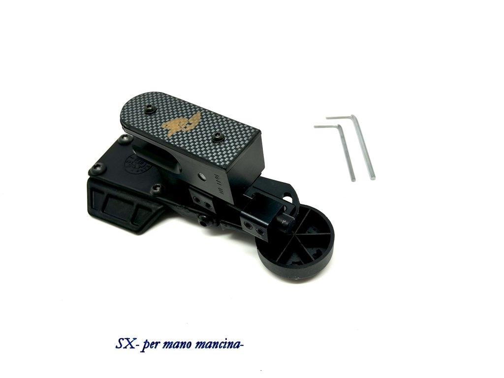 Fondina tiro dinamico sportivo per uso professionale. Estrazione rapida con movimento in avanti. L'arma è tenuta in fondina tramite la sfera situata all'altezza del ponticello. La sfera può essere messa in sicura ruotando la ruota zigrinata. Regolazione completa della lunghezza della canna, distanza passante/cintura, altezza impugnatura, tenuta arma in fondina. Altezza ideale della cintura per poter essere adattata al meglio la fondina è 4 cm. Peso lordo: 290 grammi. Prodotto in Italia.