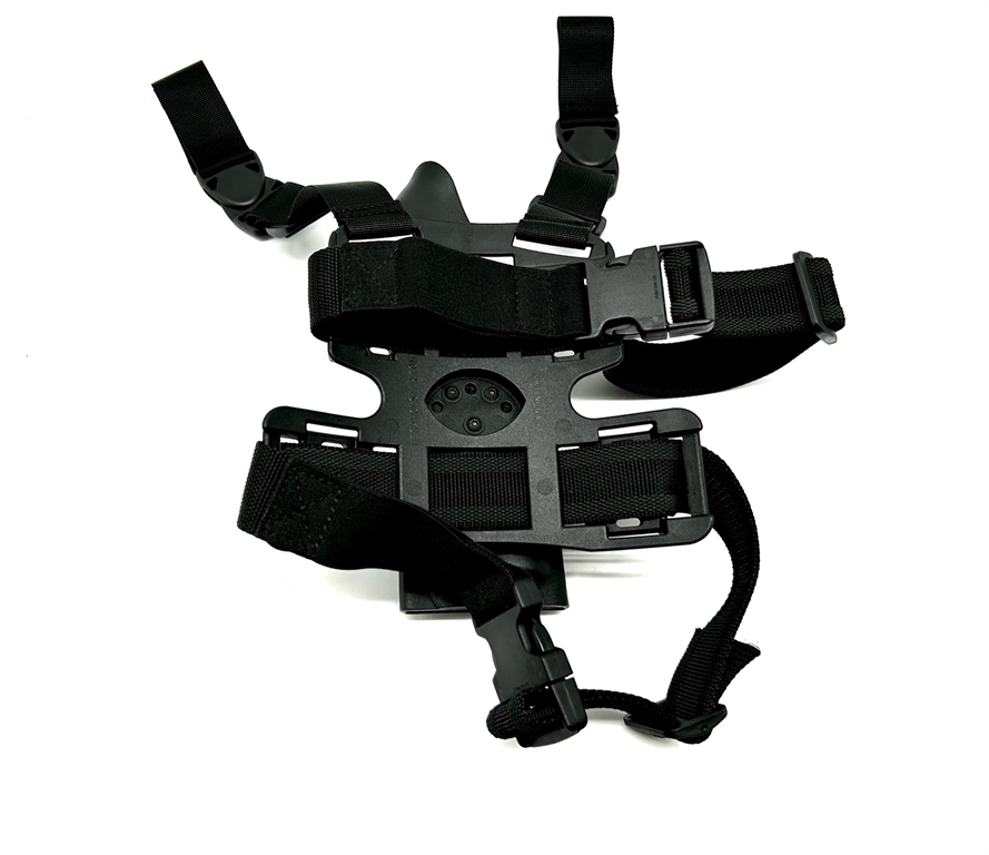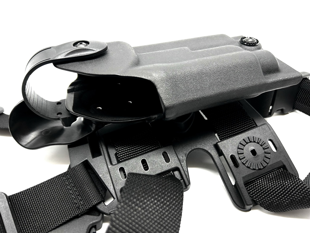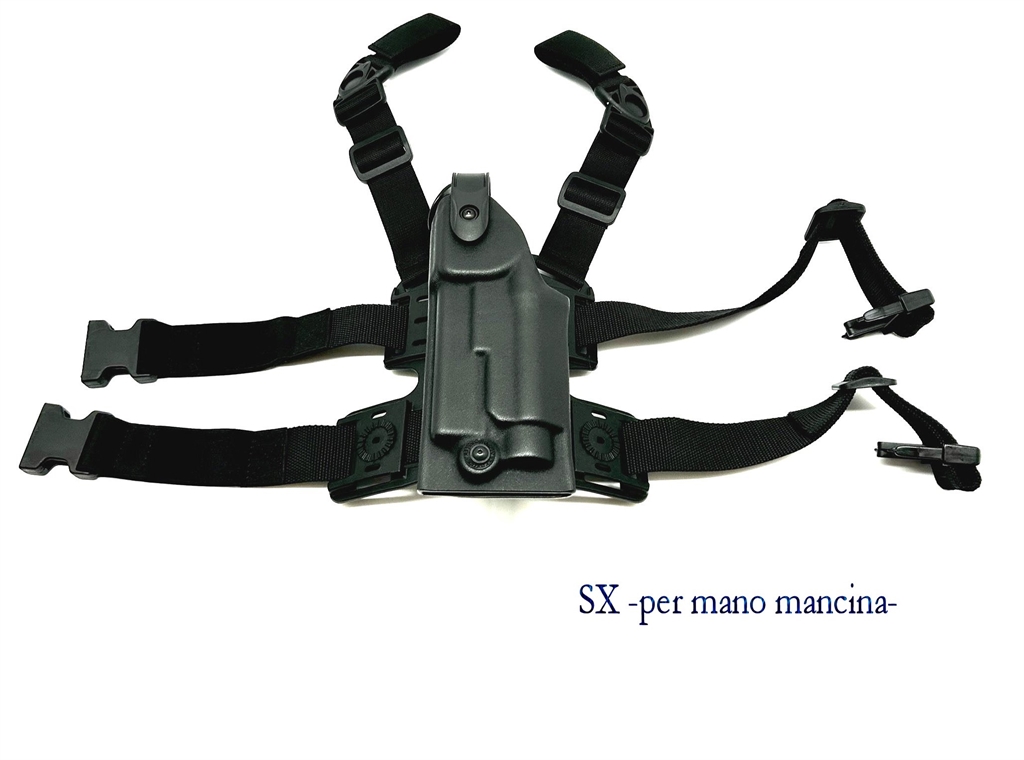 Fondina cosciale in polimero termoformato per armi con torcia tattica o laser. Foderata internamente per una maggiore protezione dell'arma. Sistema di sicurezza superiore con laccio rotativo. Vite di ritenzione sulla canna. La fondina è montata su un kit cosciale. La piattaforma cosciale presenta 4 fessure per l'inserimento di accessori tipo molle, 2 ruote dentate per l'inserimento di accessori con sistema rotativo, e 6 serie di fori per l'inserimento di accessori tramite viti. Il sistema cosciale ha due fasce in nylon con binari antiscivolo in silicone per l'ancoraggio alla coscia, e due prolunghe regolabili con fibbie ruotanti per l'attacco al cinturone. Fondina per Glock 17/19/22/23/31/32/37/38. Disponibile destra o sinistra. Colore nero. Peso lordo: 710 grammi. Prodotta in Italia.