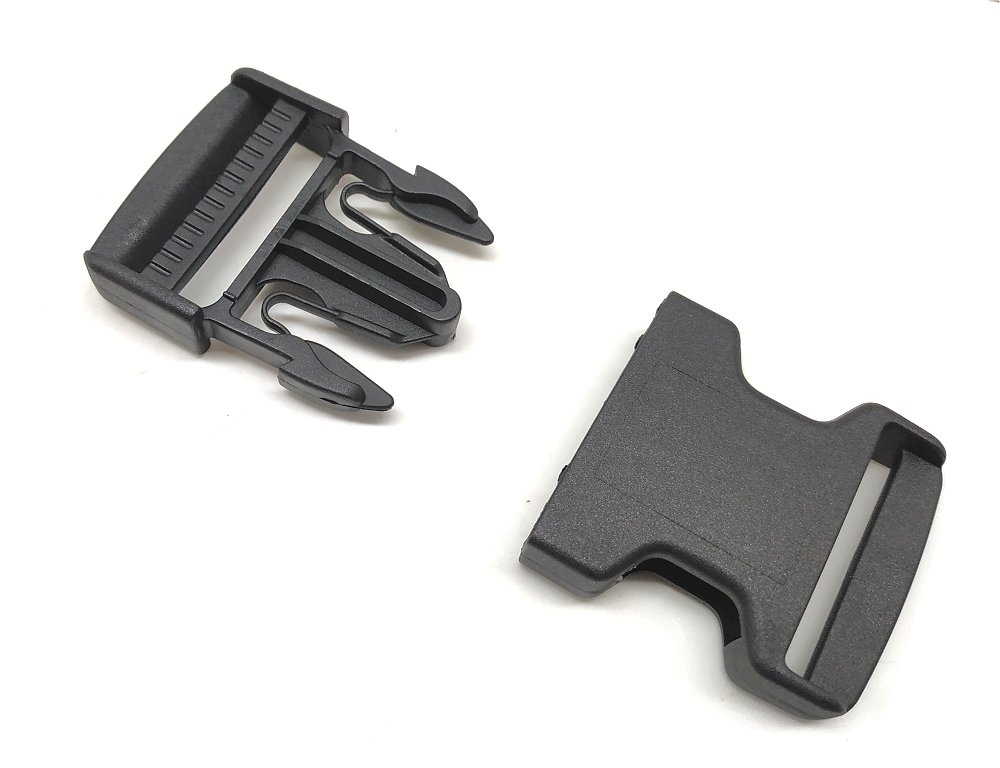 Fibbia in polimero a scatto. Altezza 4,8 cm, larghezza 7 cm. Altezza dell'asola 4 cm. Peso lordo: 20 grammi.