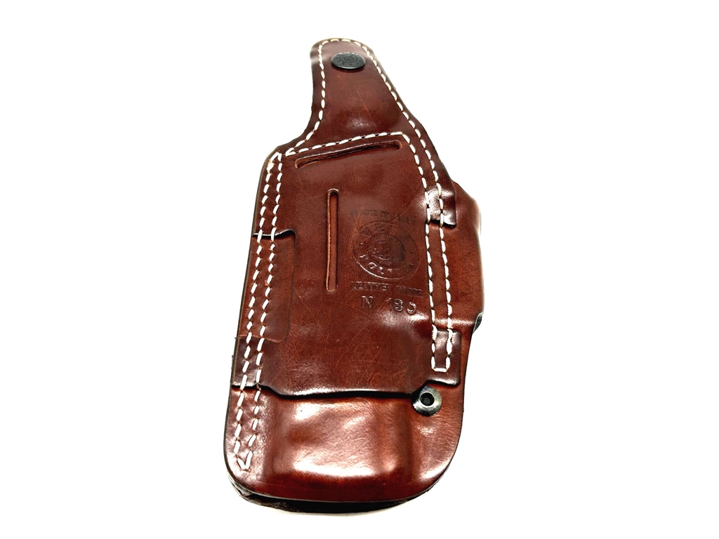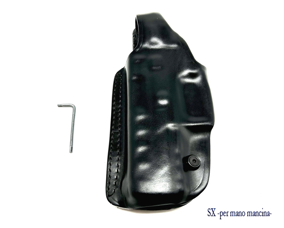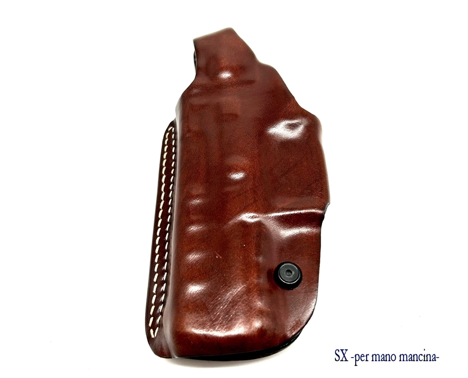 Fondina da cintura bi uso: dietro schiena orizzontale o verticale con la canna rivolta verso il basso. Fondina in cuoio ingrassato marrone o nero. Prodotta per: beretta 92, 98, 98A1,apx, px4 storm, 81, 84, 8000, 9000, caracal f, caracal c, cz75, glock 17, 19, 20, 21, 22, 23, 25, 26, 27, 29, 30, 36, 42, sig sauer pro 2022, hk usp compact, taurus g3, walter ppk, pps, ppq, p99q, p99. Le asole del passante sono per cinture alte 4 cm. Peso lordo: 135 grammi. Prodotto in Italia.