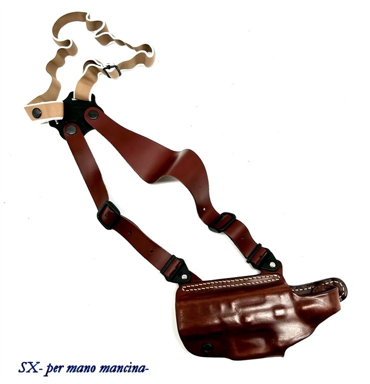 Fondina in cuoio ascellare o da cintura con sgancio rapido. 4 usi: ascellare orizzontale, a cintura sul fianco destro, cross draw e retro schiena. Prodotta per: beretta 92, 98, 84, 9000, beretta apx, px4 storm, 90 two, 98 A1, colt 1911, caracal c, caracal f, glock 17, 19, 20, 22, 23, 26, 27, 30,42 revolver da 2 pollici fino a 4 pollici, sig sauer p226, 228, 229, 230, 232, 2340, pro 2022, hk usp, spriengfield xd, walther p99, ppk, pps. In colore marrone o nero. Peso lordo: 240 grammi. Prodotto in Italia.