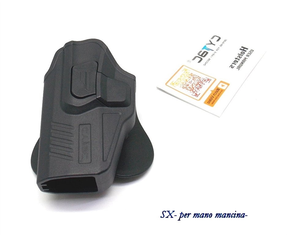 La fondina in polimero nero di alta qualità è progettata per ruotare a 360 gradi. La posizione è personalizzata dalla regolazione dell'inclinazione attraverso l'impiego della chiave a brugola in dotazione. Con paddle standard. Il meccanismo a pulsante consente di custodire l'arma in modo sicuro e contemporaneamente ne permette, se azionato, un'estrazione rapida. Peso:120 grammi. Disponibile destra o sinistra. Peso lordo: 225 grammi.