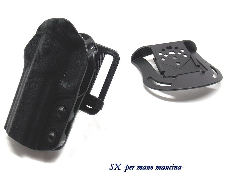 Fondina in polimero a spessore maggiorato. Doppia vite di ritenzione che agisce sul ponticello e sulla canna. Doppio sistema di passante incluso: a) paddle con inclinazioni ed altezza regolabile, b) passante asole con inclinazione ed altezza regolabile. Prodotta per le seguenti armi: beretta 92, 98,px4 storm,colt 1911 e similari,cz sp02 shadow 2, glock 17, 18,19,22,23,25,31,32,37,h&k usp compact, sig sauer pro 2022,taurus pt92,99,100,101, walther ppq, walther p99q, tanfoglio stock II. Le asole del passante sono per cinturoni alti da 4 a 5 cm. Prodotto in Italia. Peso lordo: 215 grammi.