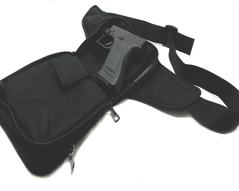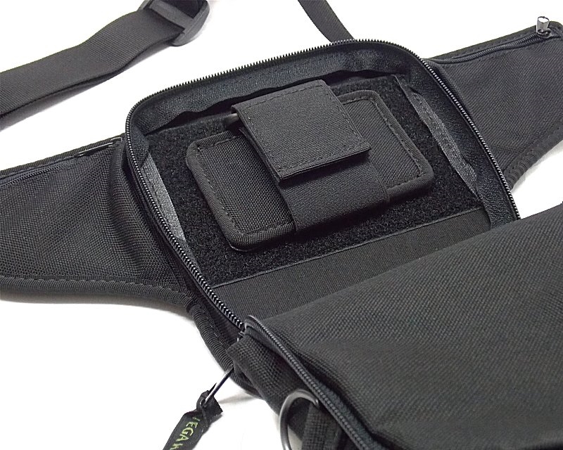 Marsupio in cordura nera. Doppia tasca frontale con chiusura a cerniera, doppie tasche laterali chiuse a cerniera. Comparto con apertura totale con cerniera in cui c'è il supporto per pistola regolabile con strip ed estraibile. Cintura regolabile in nastro con fibbia in plastica . Con due passanti con strip, per attaccarlo al cinto. Dimensioni: 16X20X5 cm. Larghezza massima 37,5 cm. Il marsupio essendo compatto è ideale per alloggiare una pistola automatica media tipo Beretta 84. Peso lordo: 275 grammi. Prodotto in Italia.