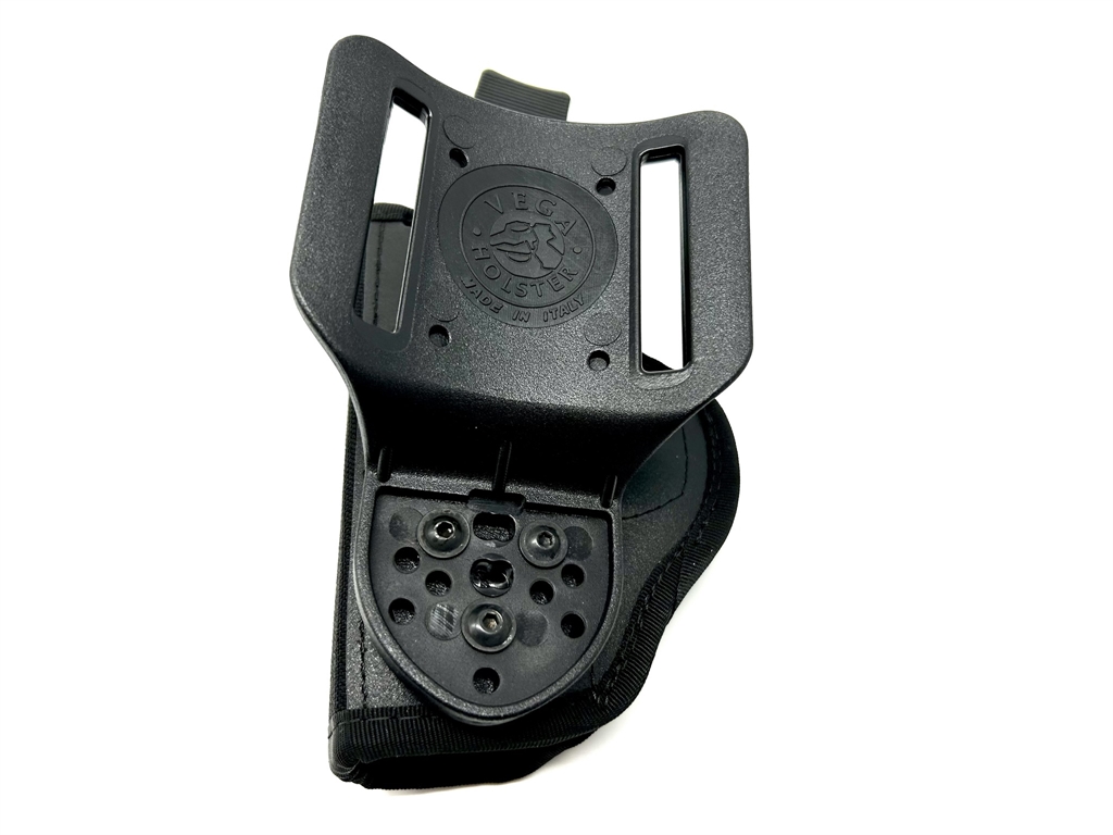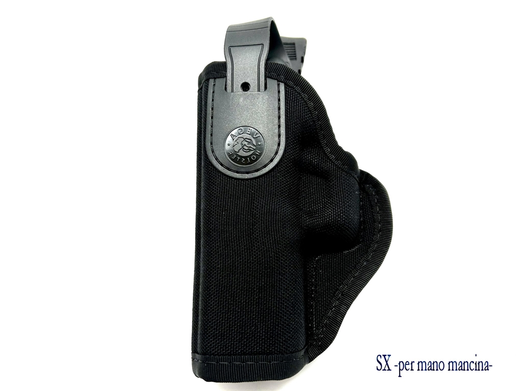 Fondina termoformata in cordura da fianco. Sgancio rapido regolabile. Posizione verticale piu inclinazioni. Prodotta per diverse tipologie di armi. Le asole del passante in polimero sono per cinturoni alti 5 cm. Colore nero. Peso lordo: 205 grammi. Prodotto in Italia.