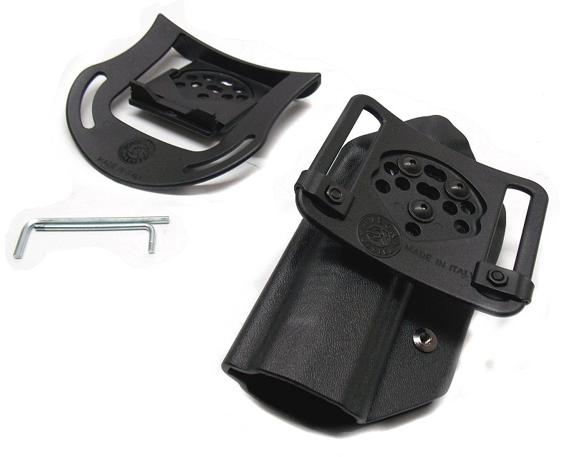 Fondina in polimero a spessore maggiorato. Doppia vite di ritenzione che agisce sul ponticello e sulla canna. Doppio sistema di passante incluso: a) paddle con inclinazioni ed altezza regolabile, b) passante asole con inclinazione ed altezza regolabile. Prodotta per le seguenti armi: beretta 92, 98,px4 storm,colt 1911 e similari,cz sp02 shadow 2, glock 17, 18,19,22,23,25,31,32,37,h&k usp compact, sig sauer pro 2022,taurus pt92,99,100,101, walther ppq, walther p99q, cz sp02 shadow 2, tanfoglio stock II. Le asole del passante sono per cinturoni alti da 4 a 5 cm. Prodotto in Italia. Peso lordo: 235 grammi.