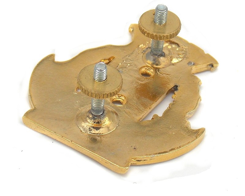 Porta fregio in metallo dorato. Dimensioni esterne: lunghezza 4,58 cm, larghezza 4,5 cm. Distanza tra le due viti 2,7 cm. Con scritta Polizia Municipale. Con 2 viti. Peso lordo:15 grammi