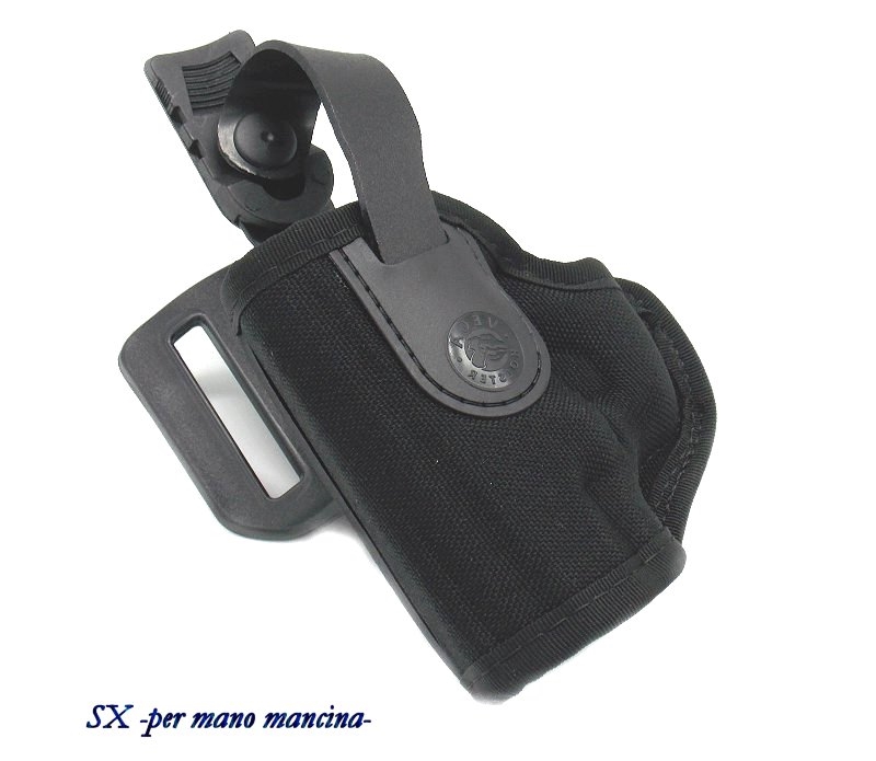 Fondina con sistema di sgancio rapido con sicura regolabile ed amovibile. Supporto in polimero che mantiene la giusta distanza dal corpo. Colori disponibili: nero, blu. Prodotta per le seguenti armi: beretta apx, beretta 92, 98, 84, px4 storm, px4 storm sub compact, 90 two, 98 A1, 8000, cz 75, 85, 83, glock 17, 19, 20, walther p99, ppq, p99q, revolver 4 pollici, taurus g3. Le asole del passante sono per cinturoni alti 5 cm. Prodotto in Italia.