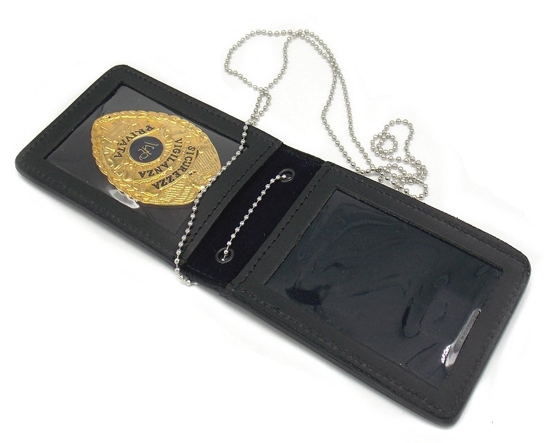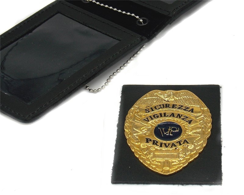 Portaplacca Vega con placca Sicurezza Vigilanza Privata, portatessera verticale in pelle, catenella amovibile e chiusura a calamita. Dimensioni: altezza 10,5 cm, larghezza 7,5 cm. . Peso lordo: 110 grammi. Prodotto in Italia.