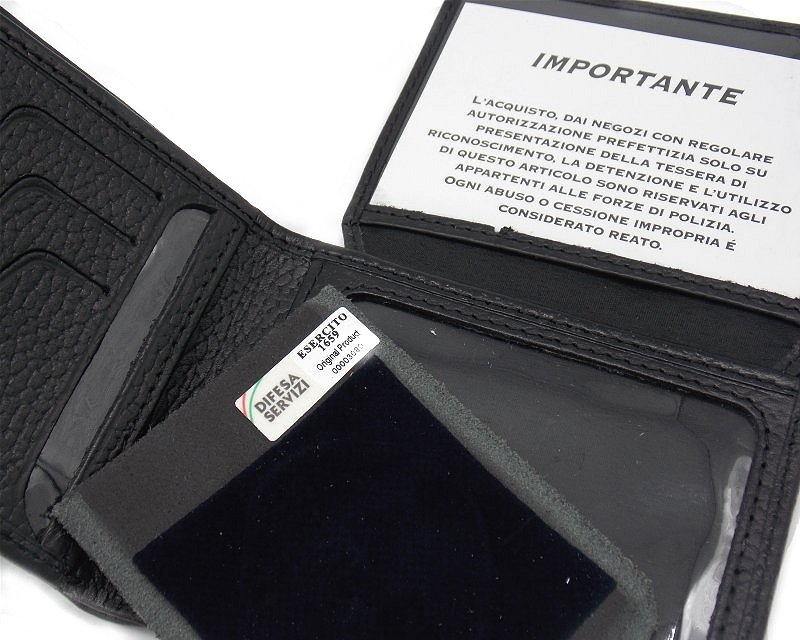 Portafoglio in pelle nappa fine e morbida. Dimensione da chiuso: larghezza 12 cm, altezza 9,5 cm. Dotato di vano portasoldi o assegni (con divisore interno), 2 vani laterali portadocumenti finestrati con plastica trasparente di cui uno usato per inserimento pattina con placca (pattina con placca Ministero della Difesa estraibile in dotazione), un vano finestrato a scomparsa portadocumenti (che copre il vano portaplacca). L'acquisto, dai negozi con regolare autorizzazione prefettizia solo su presentazione della tessera di riconoscimento, la detenzione e l'utilizzo di questo articolo sono riservati agli appartenenti alle forze di polizia. Prodotto in Italia. Peso lordo: 115 grammi.
