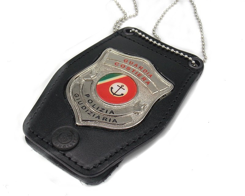 Porta placca in pelle da collo e cintura con placca Guardia Costiera. Dimensioni: lunghezza 11 cm, larghezza 8 cm. Dotato di retro passante in cuoio apribile per cintura. L'acquisto non istituzionale di questo articolo è consentito esclusivamente a coloro che dimostrino la propria Titolare appartenenza a quell'Istituto di Vigilanza, Corpo di Polizia, Ente, Ministero e Associazione che rappresenta il distintivo contenuto in questo prodotto. Ogni abuso o cessione impropria di questo prodotto è considerato reato. Peso lordo: 104 grammi. Prodotto in Italia.