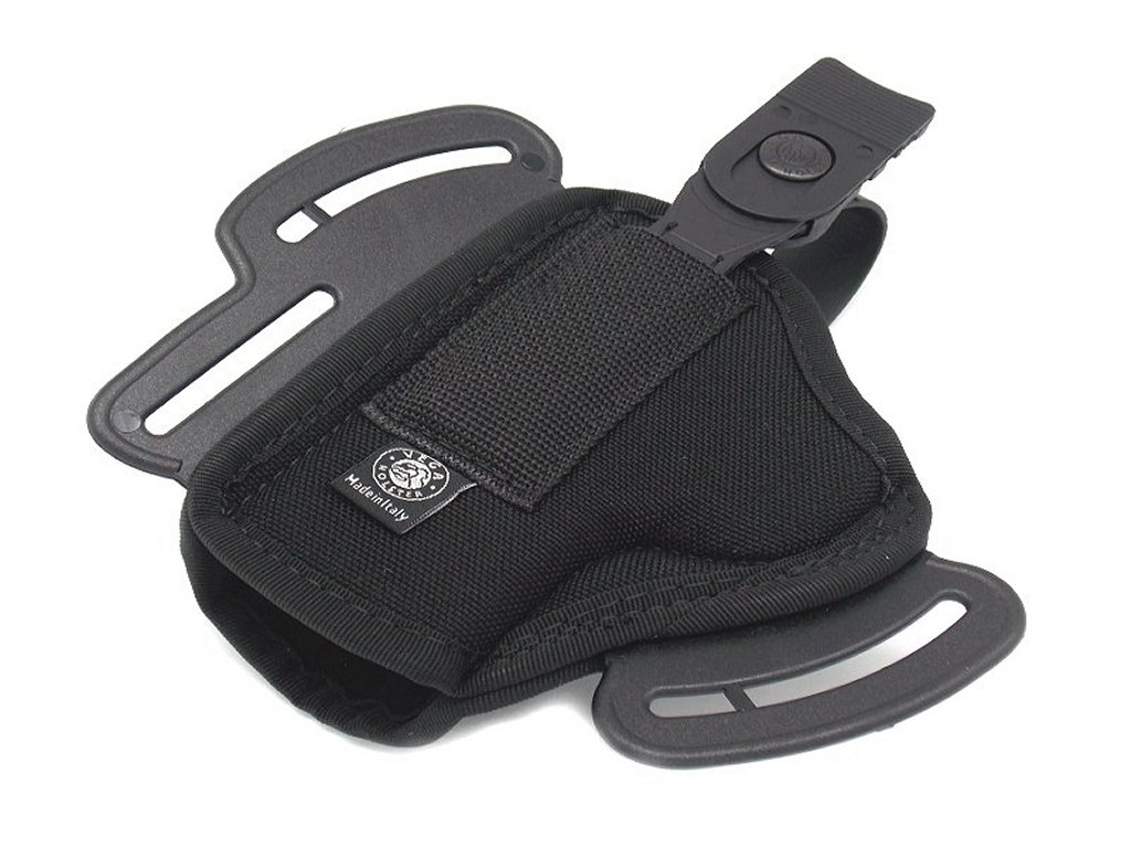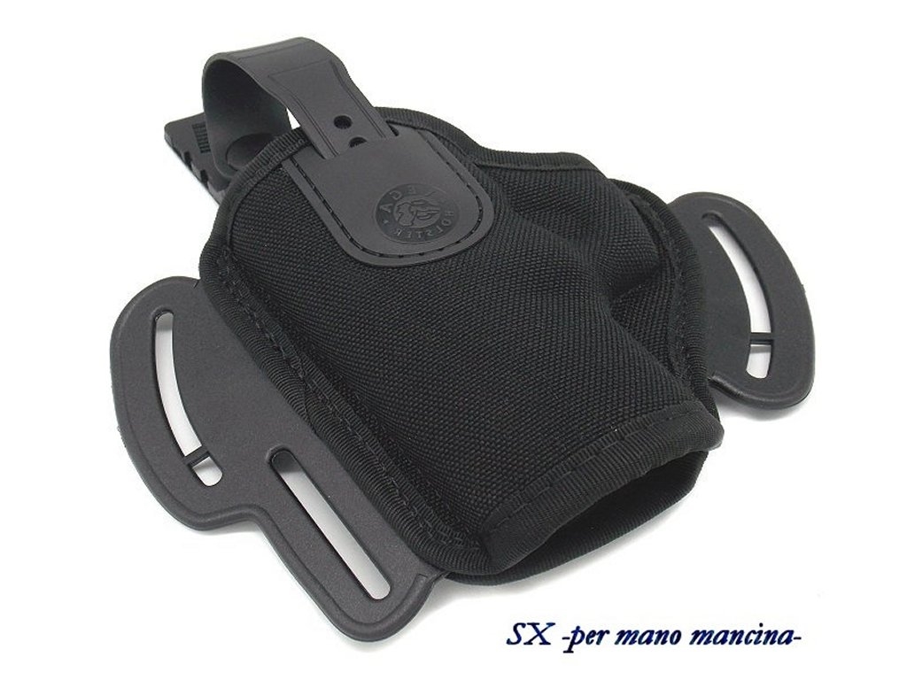 Fondina in cordura nera da cintura con sgancio rapido regolabile. Sistema passante con techno asole. Due usi: inclinata sul fianco destro o cross draw. Disponibile per: per px4 storm, 92, 96, 98, 8000, beretta apx, colt 1911, glock 17, 19, 20, 21, 22, 23, 25, 31, 32, 37, 38, hk usp compact, revolver 4 pollici, sig sauer p220, p226, p225, p228, p229, pro 2022, spriengfield 1911, taurus pt92, walther ppq, p99q, p99. Le asole del passante sono per cinture alte da 4 a 5 cm. Prodotto in Italia. Peso lordo: 110 grammi.
