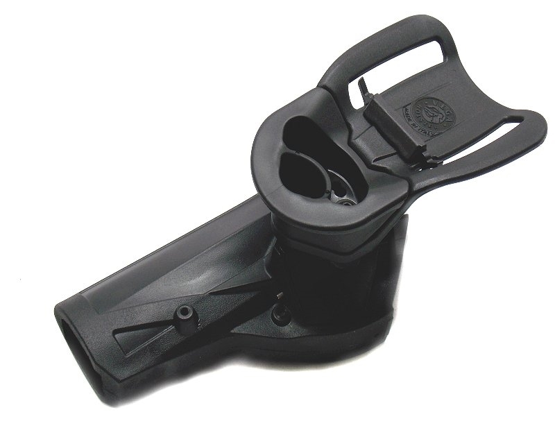 Fondina in polimero con livello di ritenzione 3. Il doppio sistema di sicura blocca l'arma sia nella parte superiore grazie al cappuccio girevole, che sul ponticello ( sicura automatica all'inserimento dell'arma in fondina). Per lo sgancio di entrambi i sistemi di sicurezza si agisce sullo stesso pulsante posto nella parte interna della fondina. Una vite di ritenzione regola la frizione della fondina sull'arma. Il passante tiene la fondina a distanza dal corpo. Le asole del passante sono per cinturoni alti fino a 6 cm. Brevetto internazionale. Disponibile: destra e sinistra. Colore nero. Prodotto in Italia. Peso lordo: 355 grammi.