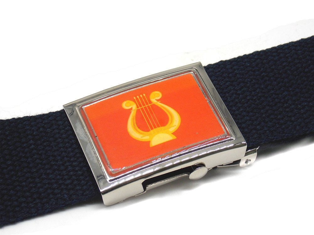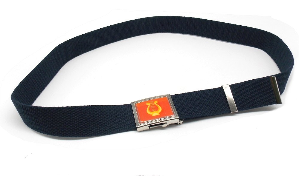 Cintura in tela blu, altezza di 4 cm e lunghezza fino a 126 cm regolabile. Fibbia in metallo con la stampa della cetra. Peso lordo: 180 grammi. Prodotto in Italia.