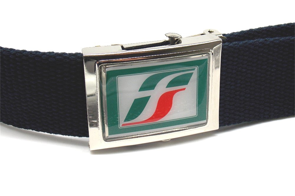 Cintura in tela blu notte con altezza di 4 cm e lunghezza fino a 125 cm regolabile (misure più lunghe, a richiesta) Fibbia in metallo stampato con logo ferrovie dello stato. Peso lordo: 160 grammi. Prodotto in Italia.