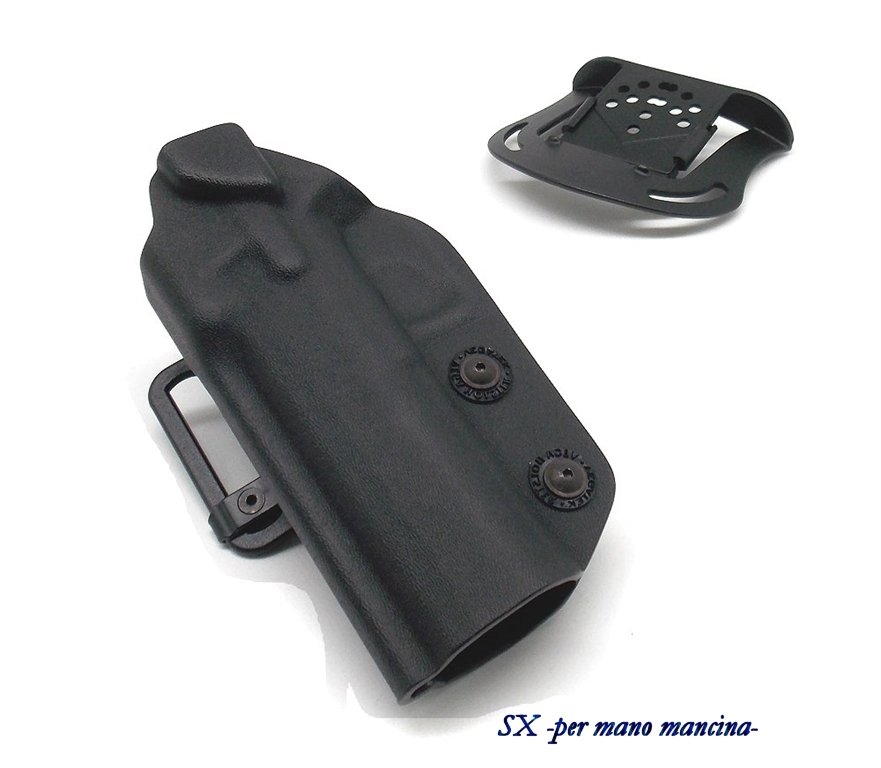 Fondina in polimero a spessore maggiorato. Doppia vite di ritenzione che agisce sul ponticello e sulla canna. Doppio sistema di passante incluso: a) paddle con inclinazioni ed altezza regolabile, b) passante asole con inclinazione ed altezza regolabile.Prodotta per le seguenti armi: beretta 92, 98, px4 storm , colt 1911 e similari, cz sp02 shadow 2, glock 17, 18, 19, 22, 23, 25, 31, 32, 37, h&k usp compact, sig sauer pro 2022, taurus pt92, 99, 100, 101, walther ppq, walther p99q. Le asole del passante sono per cinturoni alti da 4 a 5 cm. Prodotto in Italia. Peso lordo: 260 grammi.