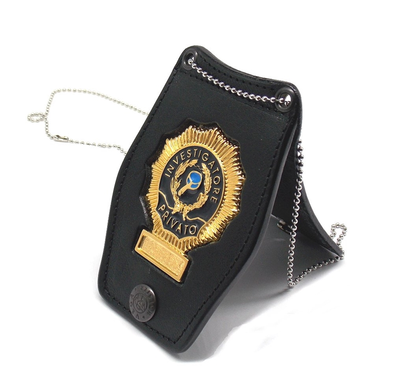 Porta placca in pelle da collo e cintura con placca Investigatore Privato. Dimensioni: lunghezza 11 cm, larghezza 8 cm. Dotato di retro passante in cuoio apribile per cintura. Peso lordo: 78 grammi. Prodotto in Italia.