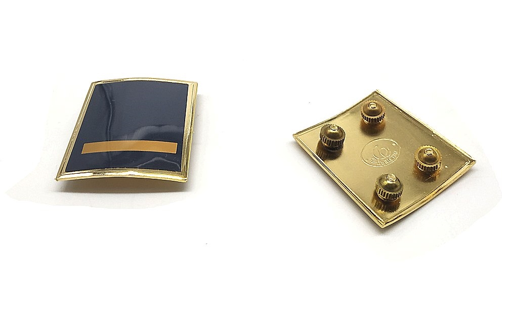 Coppia di gradi per spallina di giacca. Chiusura con 4 viti con dado tornito a coppiglia. Forma trapezoidale: lunghezza 4,6 cm, larghezza 4,1/4,3 cm, spessore 1,5 mm. Peso lordo: 64 grammi.