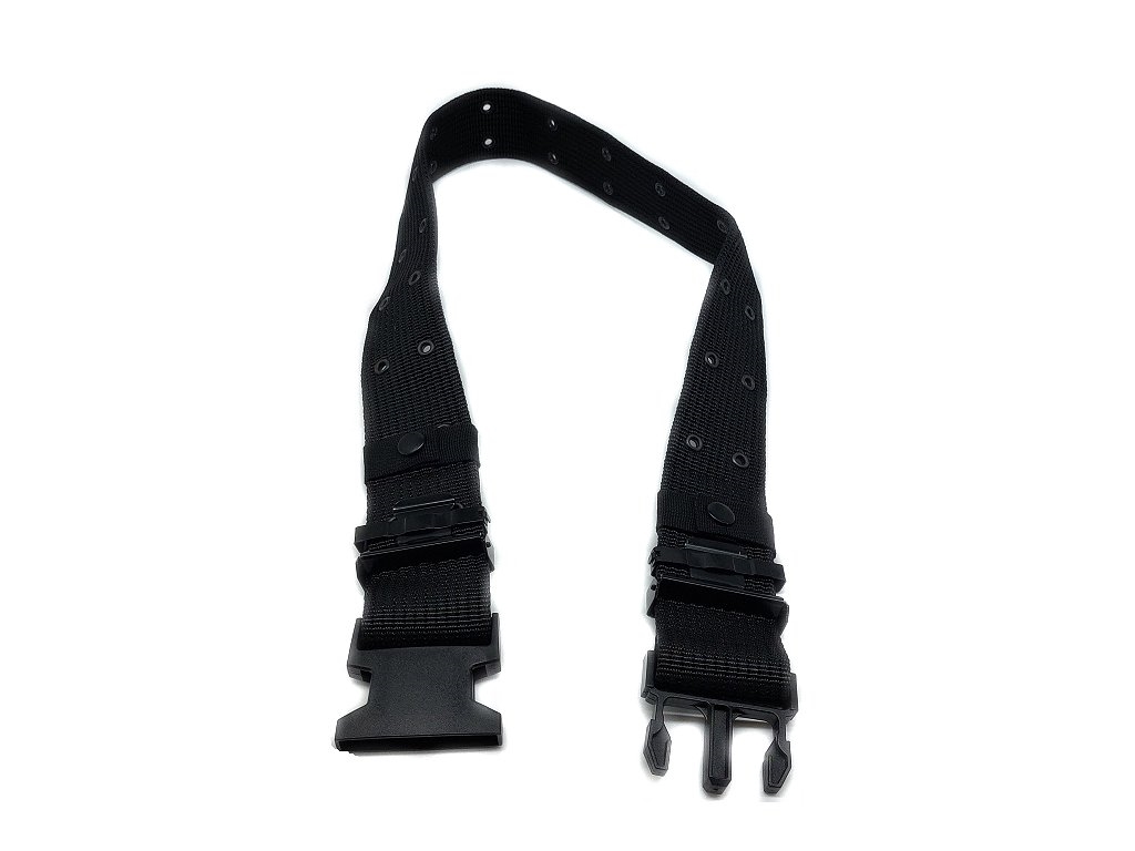 Cintura con 2 fori (16 coppie verticali equidistanti orizzontalmente 2 cm, taglia regolabile). Fibbia in plastica a scatto. Colore nero. Altezza 5,4 cm, lunghezza massima 108 cm in nylon extraforte, passanti in metallo regolabili, fermi in metallo di regolaggio esterni. Peso lordo: 181 grammi.