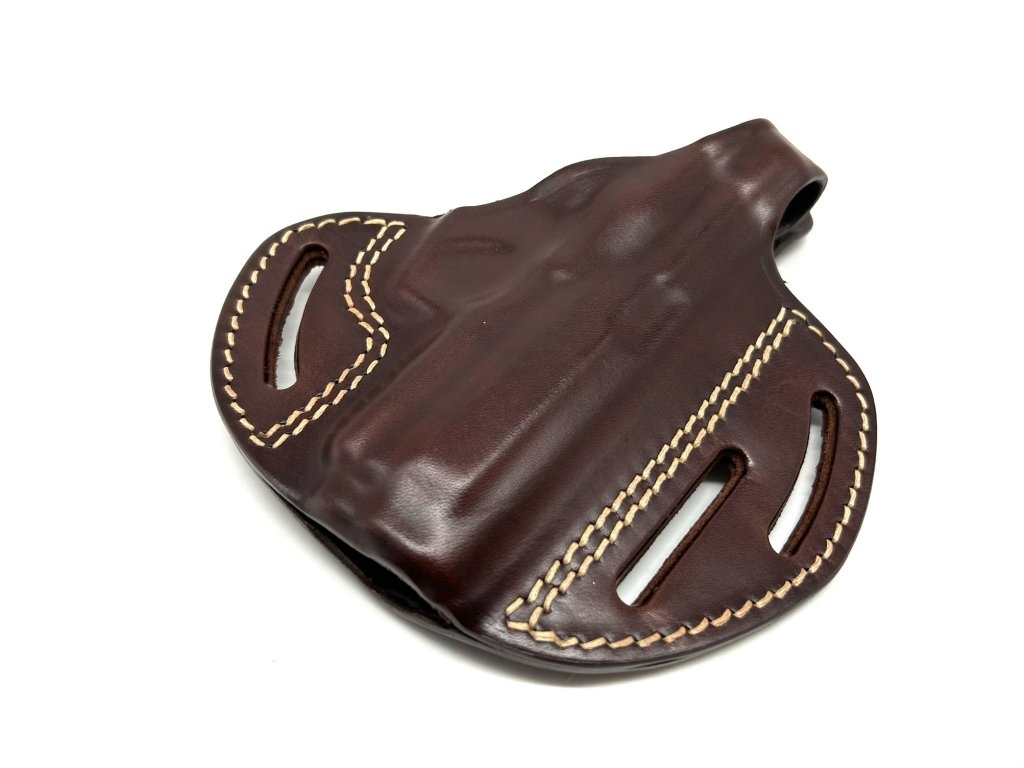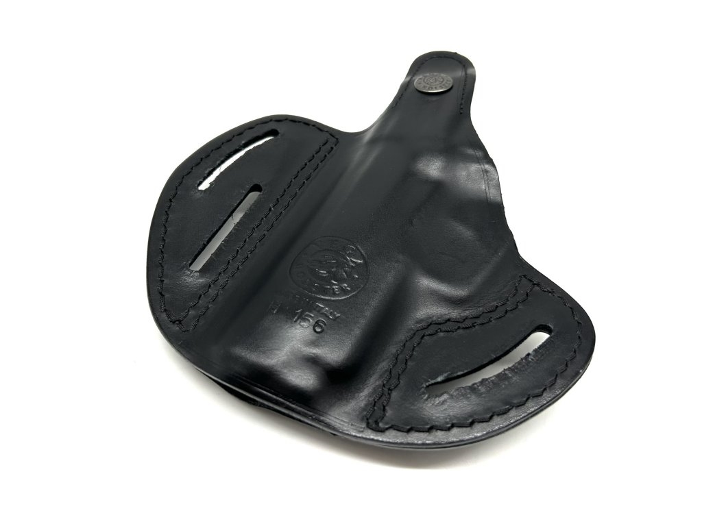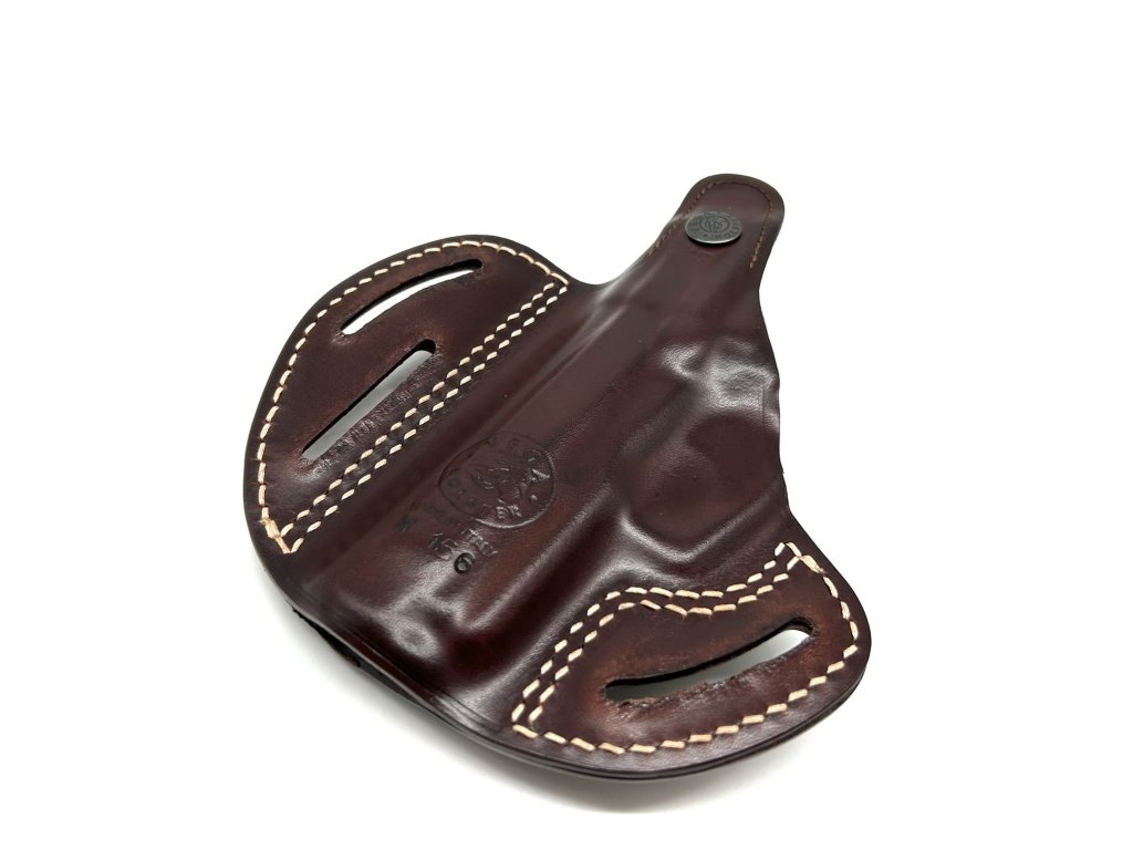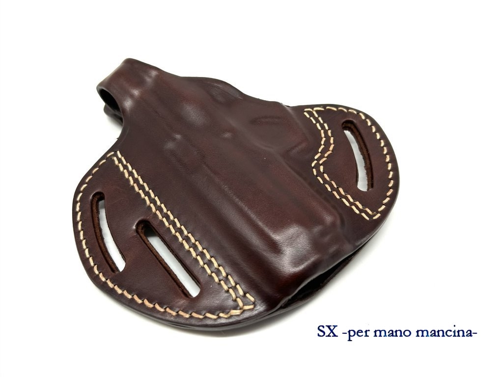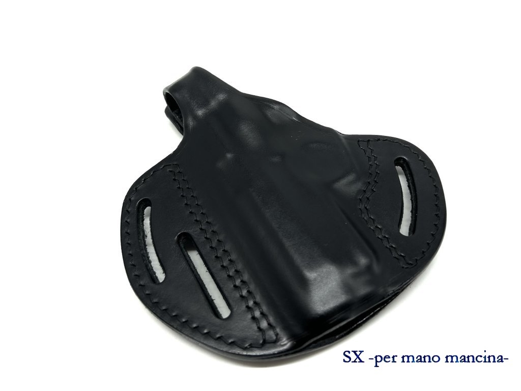 Fondina da cintura in cuoio con sgancio rapido, 3 asole che consentono una diversa inclinazione. Prodotta nei colori nero o marrone, per vari tipi di pistole e revolver come: beretta 92, 98, 84, 8000, px4 storm, 90 two, 98 A1, beretta apx, bersa thunder 9, glock 17, 19, 20, 21, 22, 31, 37, 43,caracal c, caracal f, colt 1911, hk usp, hk usp compact, spriengfield xd, walther ppk, ppq, p99, p99q, revolver da 2, 3 e 4 pollici e altri modelli. Peso lordo: 115 grammi.
