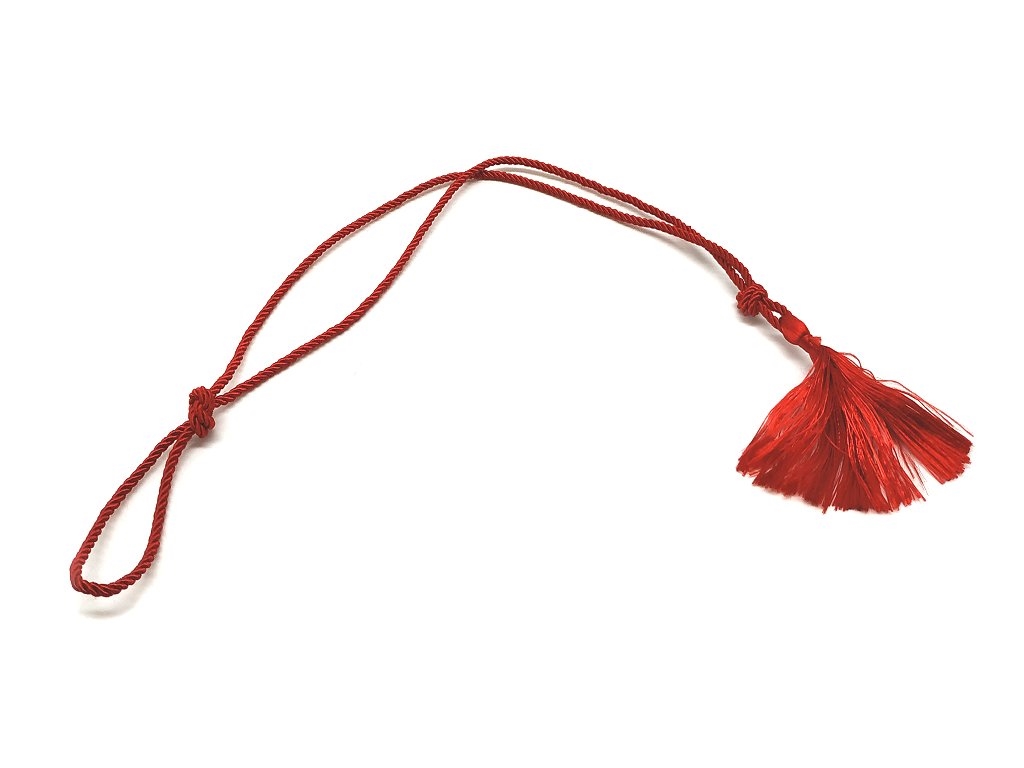 Cordoncino in tessuto rosso intrecciato con nappina. Lunghezza utilizzabile 32,5 cm, lunghezza totale senza nappina 38 cm. Peso lordo: 4 grammi. Diametro 3 mm.