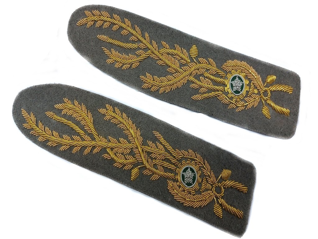 Coppia di alamari per giacca in tessuto ricamato, fiorame oro fondo verde. Lunghezza 19,5 cm, larghezza massima 4,5 cm. Prodotto in Italia. Peso lordo: 27 grammi