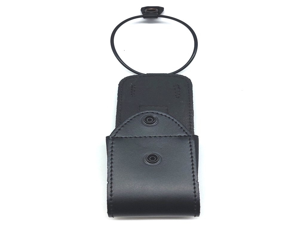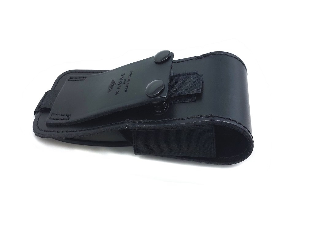Porta radio VHF universale in pelle, applicazione in cintura mediante passante apribile con due bottoni a scatto, fianchi laterali in elastico. Peso lordo: 110 grammi. Colore nero.