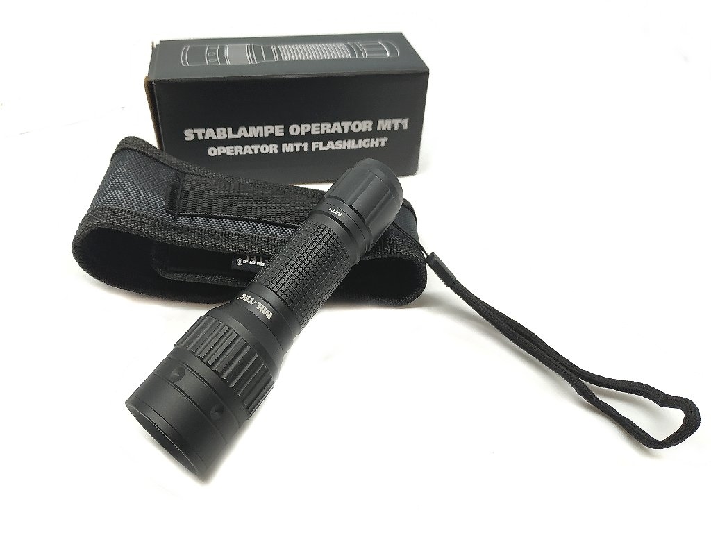 Torcia tattica nera in alluminio con pulsante posteriore , funzionamento con tre battere AAA non incluse. Misure : 13 cm x 3,5 cm di diametro parabola , dotata di fodero in cordura nera .