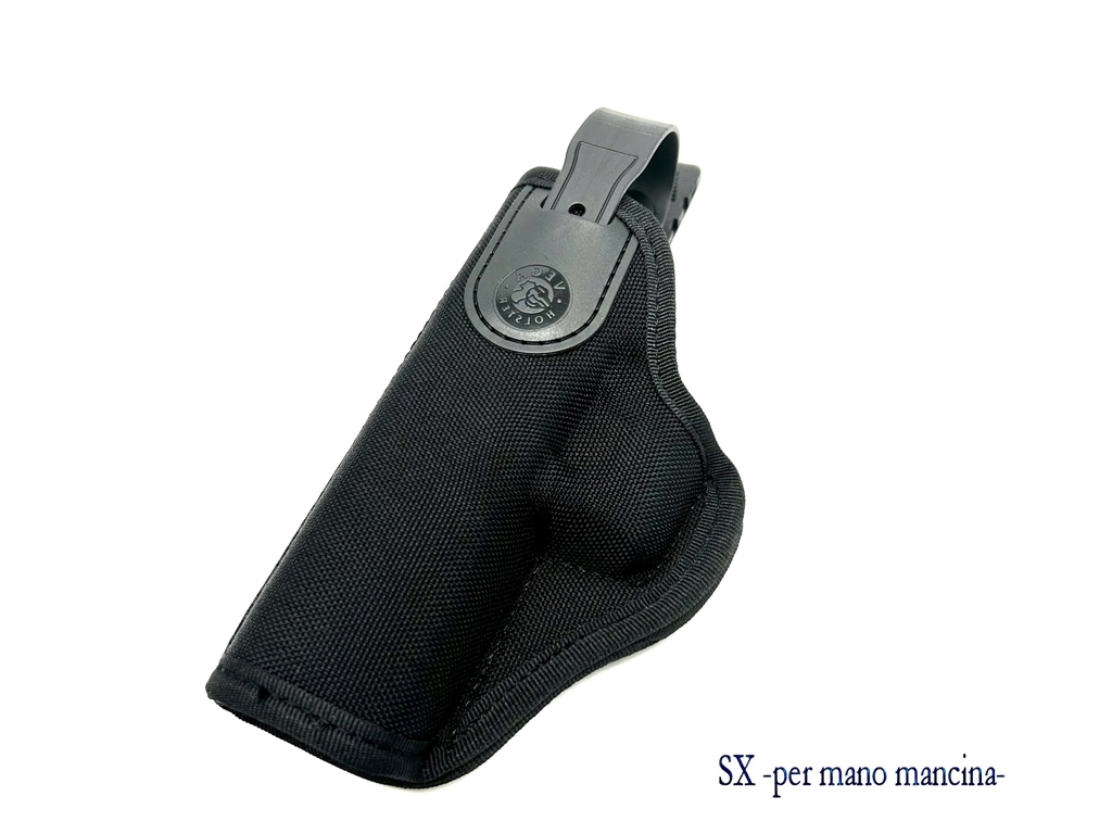 Fondina da cintura in cordura dotata di sgancio rapido con sistema di sicura vega stop snap. Posizione inclinata fianco destro. Le due asole del passante sono per cinture alte 4 cm e sono predisposte pure per cinturoni alti 6 cm. Disponibile per large auto tipo beretta 92, 98, px4 storm, 8000, 9000, 84, beretta apx, revolver 2 e 4 pollici, glock 17, 19, 20, 23, 25, 27, 29, 32, 38, 42,43, colt 1911, sig sauer p225, p228, p229, walther pps, ppq, p99q, p99. Peso lordo: 90 grammi. Prodotto in Italia.
